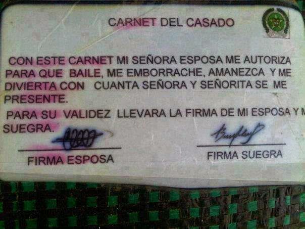 Con este carnet mi señora me autoriza, para que baile, me emborrache, amanezca y me divierta con cuanta señora y señorita se me presente.